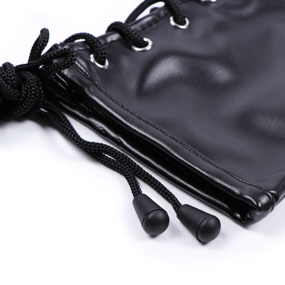 Ein Fausthandschuh aus PU-Leder. Mit sicherem Fesselriemen und Schnürung um das Handgelenk.