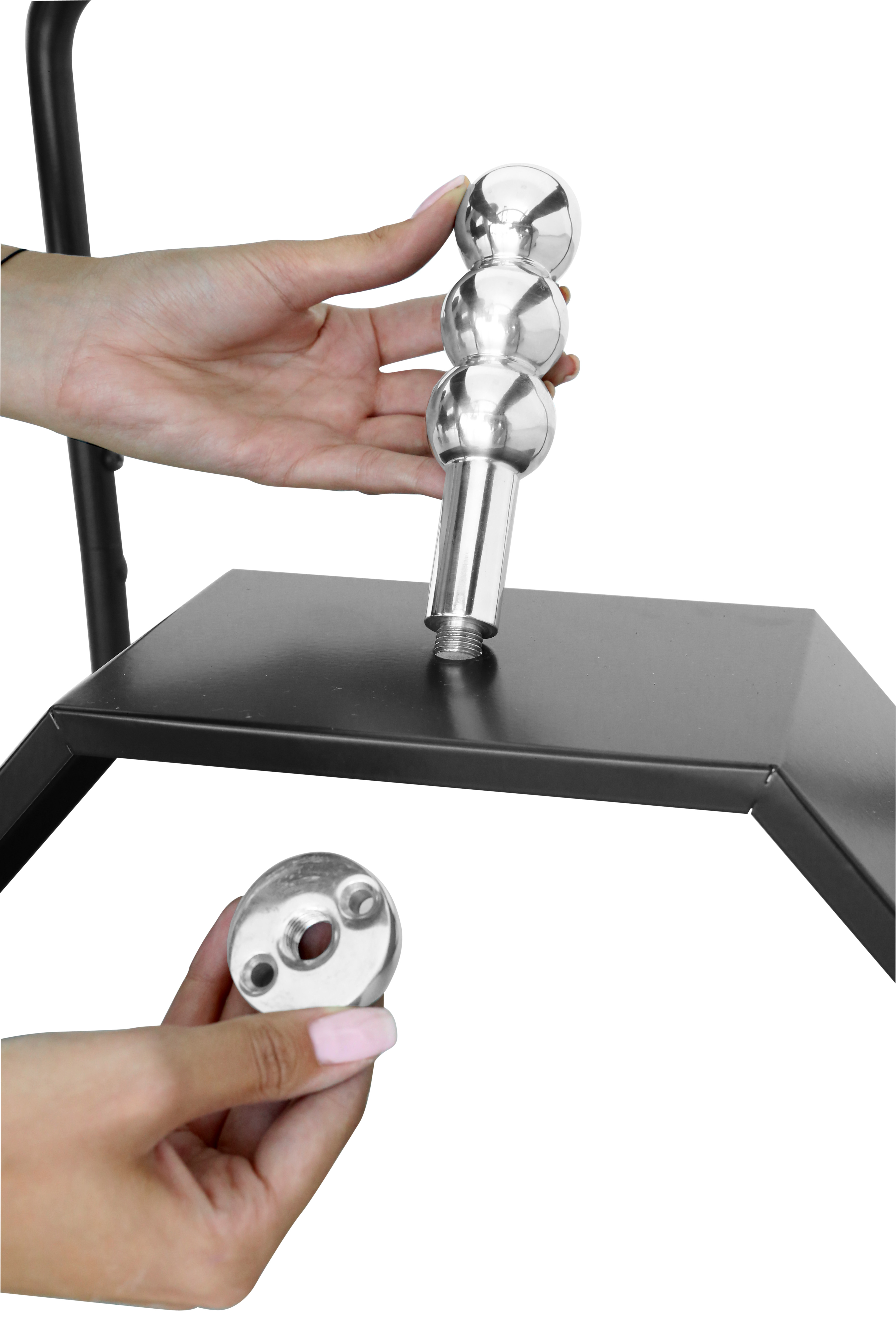 Die Metallplatte hat ein kleines Loch zum Anbringen eines Metalldildos (Metalldildo nicht im Lieferumfang enthalten).