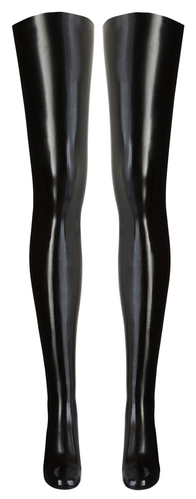 Oberschenkellange Latex-Strümpfe.