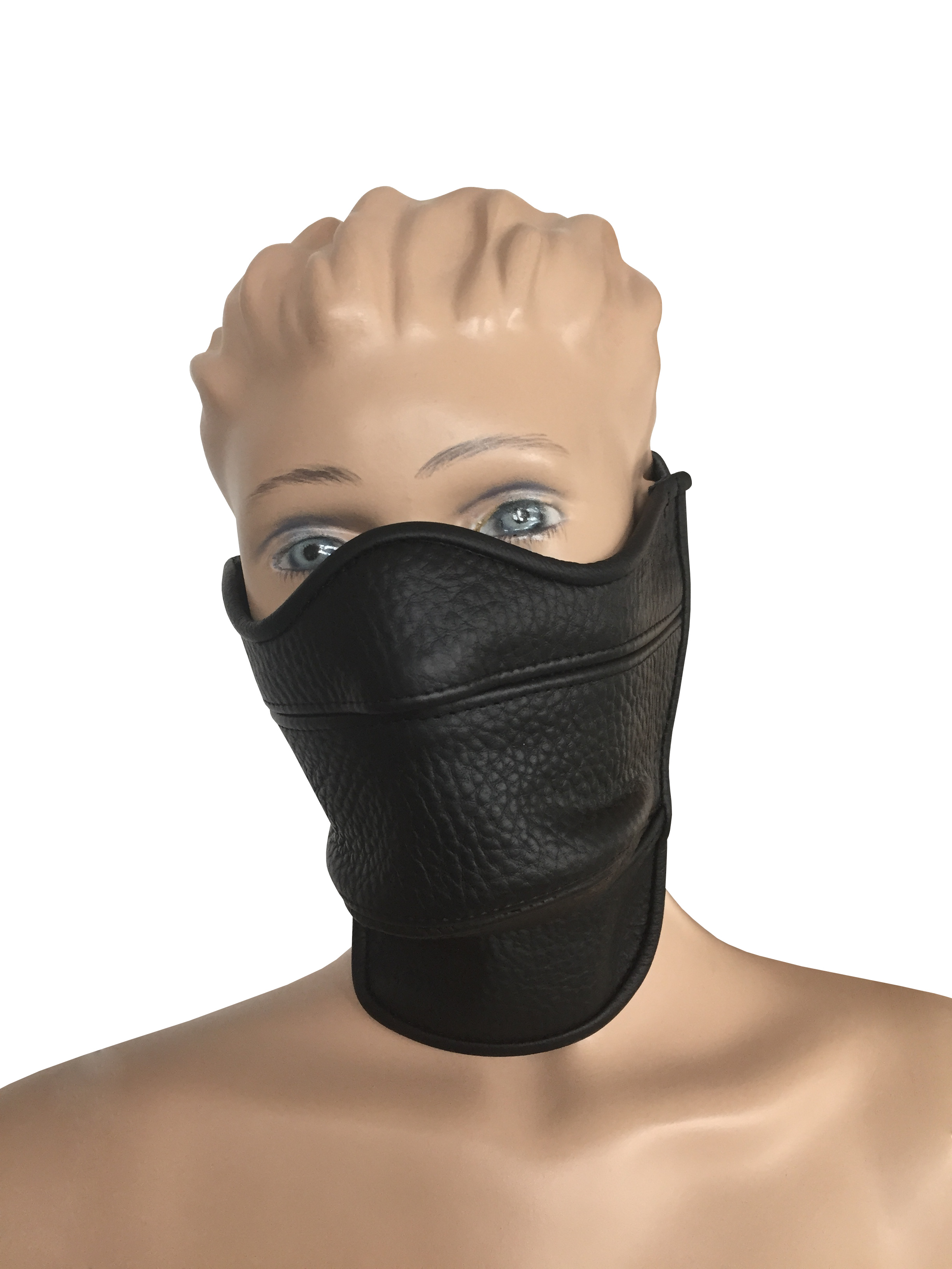 Maske aus weichem Leder mittels Riemen verstellbar.