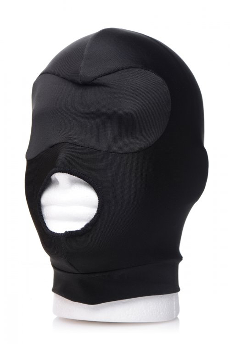 Die Kapuze ist aus weichem und elastischem Material und hat eine integrierte Augenbinde mit Polsterung, sodass sie die Sicht des Trägers vollständig wegnimmt.